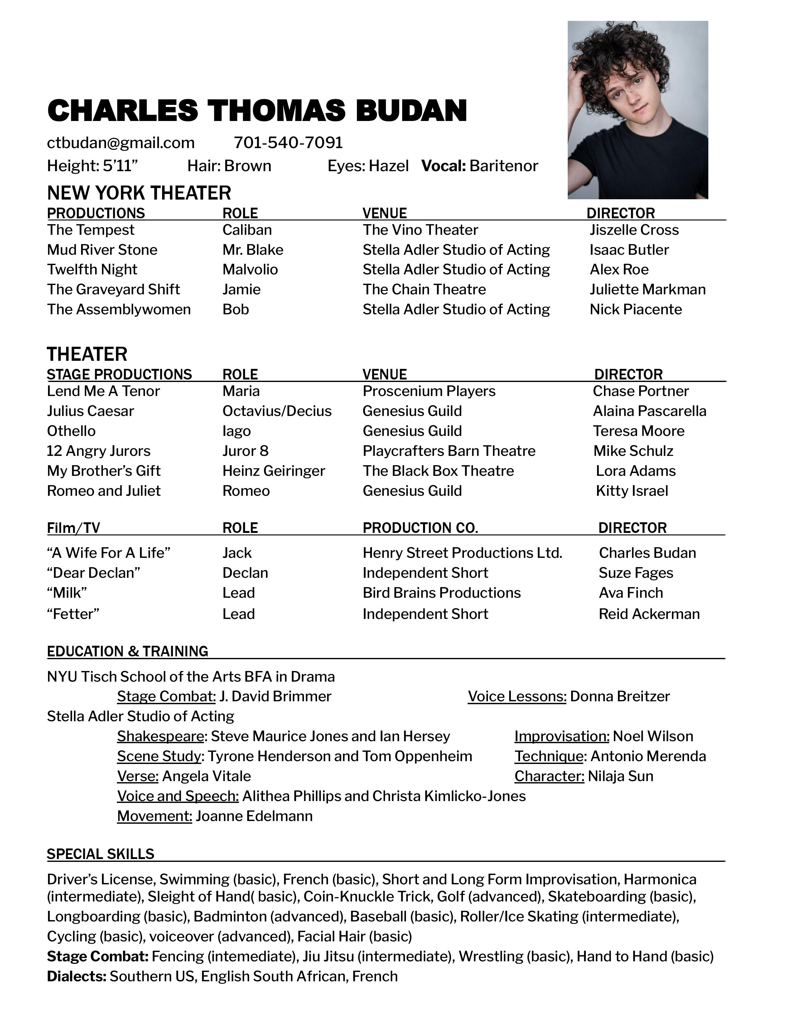 Charles Thomas Budan is a New York-based actor and filmmaker from Eastern Iowa. As a teenager, Charles was enchanted by Westerns and Crime sagas before digging deeper into foreign movies and documentaries. But his frustration with the lack of filmmaking opportunities in his hometown inspired him to look for a new creative outlet. He found it in the local community theatre scene where he discovered his love for plays both new and classic.Charles graduated from NYU’s Tisch School of the Arts with a BFA in Acting and a Minor in Film. He recently wrapped production on his short film adaptation of Eugene O'Neil's A Wife For A Life. In the coming weeks, he will be starring in Mud River Stone at The Stella Adler Studio of Acting and next month as Caliban in The Tempest at The Vino Theater.